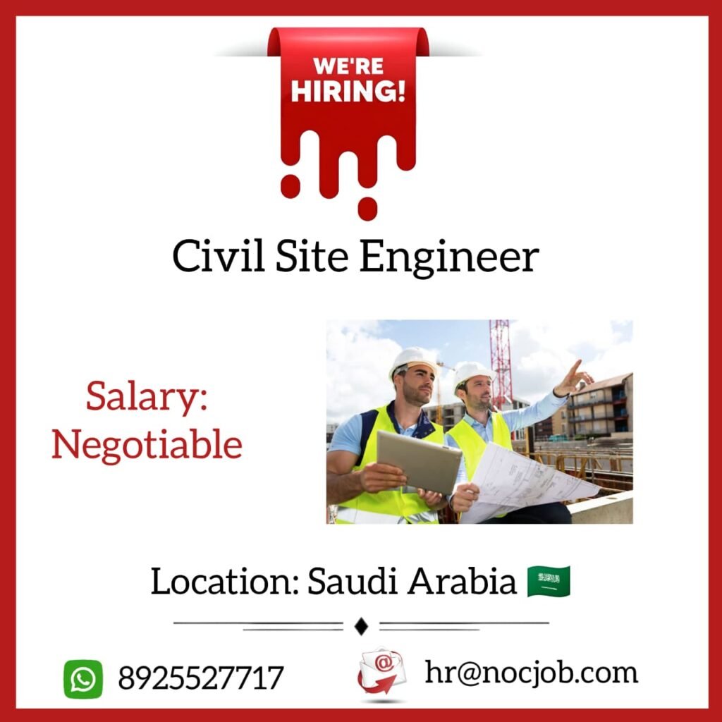 Job Opening: Site Civil EngineerLocation: Saudi ArabiaSalary Range: SAR 7,000 – 10,000 (based on experience and interview performance) Job SummaryWe are seeking an experienced Site Civil Engineer for a reputed project in Saudi Arabia. The role involves supervising civil construction activities at site, ensuring quality, safety, and timely execution of work in accordance with project specifications and international standards. Candidates must have strong experience in Oil & Gas, Refinery, Petrochemical, and EPC projects, along with proven GCC experience. Key Responsibilities– Supervise and manage day-to-day civil construction activities at site– Ensure all works are executed as per approved drawings, specifications, and project schedules– Coordinate with project managers, consultants, subcontractors, and other engineering disciplines– Monitor site progress, manpower, materials, and equipment utilization– Ensure strict compliance with HSE standards and project safety procedures– Conduct site inspections and quality checks to maintain high construction standards– Review method statements, work permits, and inspection reports– Resolve technical and execution-related issues at site– Prepare daily and weekly progress reports and submit to management Eligibility Criteria– Bachelor’s Degree / Diploma in Civil Engineering– Minimum 8 years of relevant experience in Oil & Gas, Refinery, Petrochemical, and EPC projects– GCC experience is mandatory– Strong knowledge of international construction codes and standards– Ability to work independently and handle site responsibilities effectively– Age limit: Up to 48 years Employment Benefits– Working Hours: 8 hours per day + Overtime– Food and accommodation provided by the company– Opportunity to work with a direct client on a reputed international project Interview DetailsInterview Type: Direct Client InterviewInterview Date: 28 December 2025Interview Location: Thirunelveli, Tamil Nadu Interested and eligible candidates are requested to attend the interview as scheduled with all required documents. CONTACT: 8925527717 | hr@nocjob.com