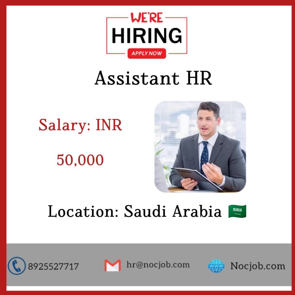 URGENT REQUIREMENT FOR SAUDI ARABIA Job Title: Assistant HR Location: Saudi Arabia Salary: SAR 2,000 Experience: 3-5 years in the same field Requirements: Key Responsibilities: Terms and Conditions: If you are a motivated and experienced HR professional looking for a new challenge, please contact us CONTACT: 8925527717 | hr@nocjob.com