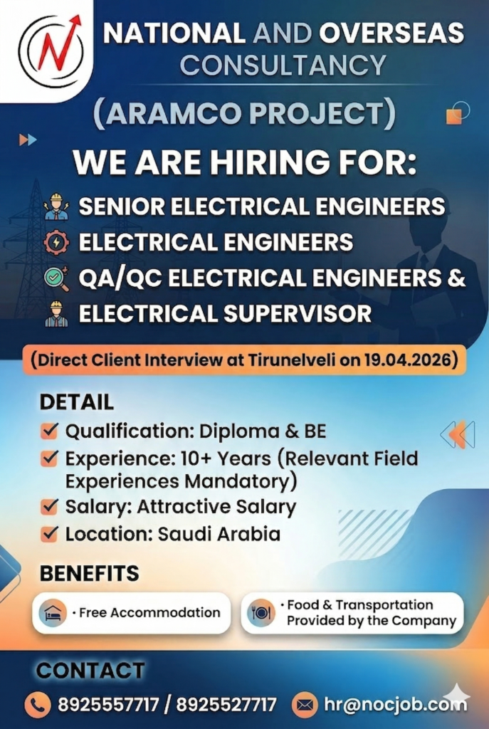 National and Overseas Consultancy is recruiting experienced electrical professionals for a high-profile Aramco Project located in Saudi Arabia. This recruitment drive is for senior-level technical and oversight positions within the electrical engineering sector.